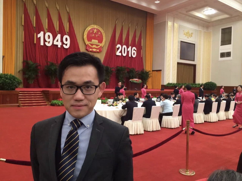 图为牟翔校友代表新港青年会出席国务院五部委庆祝国庆六十七周年招待会