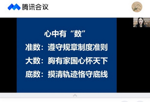 疫情防控心中有“数”。会议围绕“战疫邮我,共克时艰”主题展开,辅导员鲍捷强调在校大学生在疫情防控期间要做到心中有“数”。“数”包括三个层面:第一,准数。“柚子们”要遵守各层各级各类疫情防控相关规章、制度与准则,确保精准理解,规范执行。第二,大数。“柚子们”要做到胸有家国,心怀天下。时时关注疫情防控消息,常怀大局观,树牢生命安全重于泰山观念,树立命运共同体意识。第三,底数。“柚子们”要恪守疫情防控底线,严格自律,做到有所为有所不为。