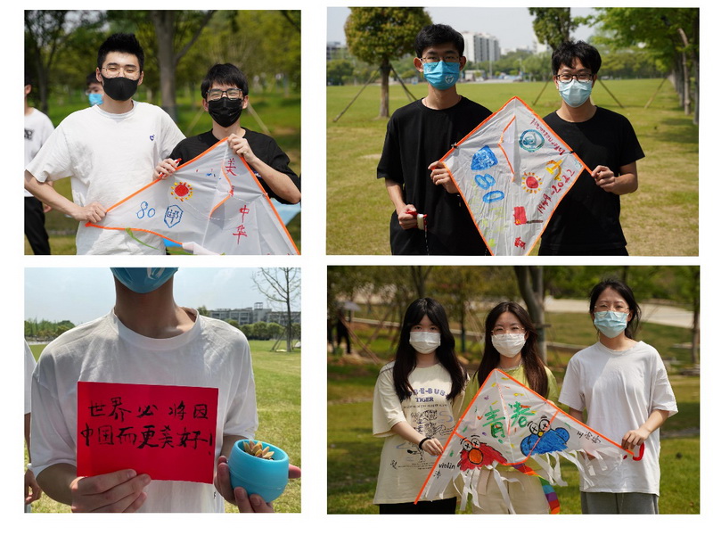 同学们与手绘风筝和写着祝福的卡纸合影
