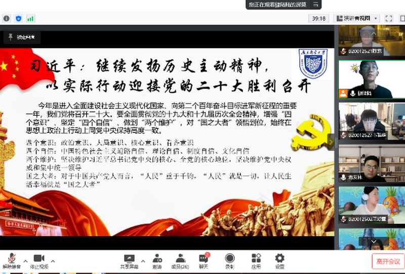 4月11日晚,支部全体同学相约腾讯会议,团支书张伟麟同学带领大家一同学习习近平总书记关于“继续发扬历史主动精神,以实际行动迎接党的二十大胜利召开”的重要讲话,重点介绍了“四个意识”“四个自信”“两个维护”“国之大者”等党史关键词,并带领大家重温了入团誓词。同学们一起观看《觉醒年代》的经典片段,激励着同学们在新的学期撸起袖子加油干,担负起历史交给我们的重担。