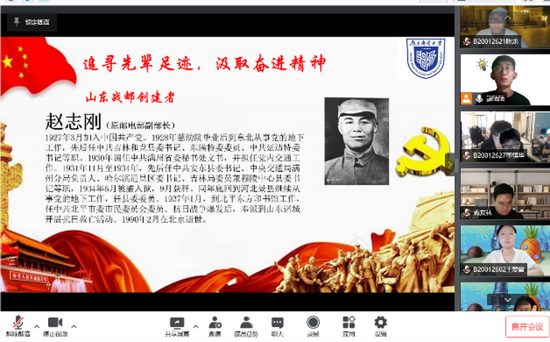 为庆祝我校80周年校庆,引导同学们学习红色校史,乔文锴、季念聪、邹雨等同学向大家介绍了我校首任党委书记兼院长秦华礼、战邮英雄赵志刚和肖华光等人的英雄事迹,激励同学们传承南邮红色基因,在未来的学习和生活中践行南邮精神。