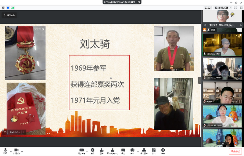 陈龙和杜静怡两位同学分别向大家介绍了他们外公“光荣在党50年”的光辉事迹,陈龙的外公刘太骑寄语支部青年要珍惜当前美好生活,能吃苦,肯奋斗,主动接过党的红色大旗,成为社会栋梁。杜静怡的外公司同滨是一位党龄六十多年的老党员,作为技术兵出身的他深情寄语新一代青年踏实学习专业知识,为祖国和民族的未来添砖加瓦。