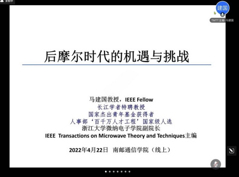 4月22日下午,国家级人才称号获得者、IEEE Trans Microwave Theory and Techniques主编、浙江大学微纳电子学院副院长马建国教授在线上为太阳集团tyc151cc师生作题为“后摩尔时代的机遇与挑战”专题报告。本次报告是我院为加强师生学术交流,学习微电子领域前沿研究成果,提高学生科研创新能力的重要学术活动,也是在我院举办的庆祝建校80周年系列学术活动之一。报告由太阳集团tyc151cc院长周亮教授主持,通院青年教师和研究生两百多人线上聆听了报告。