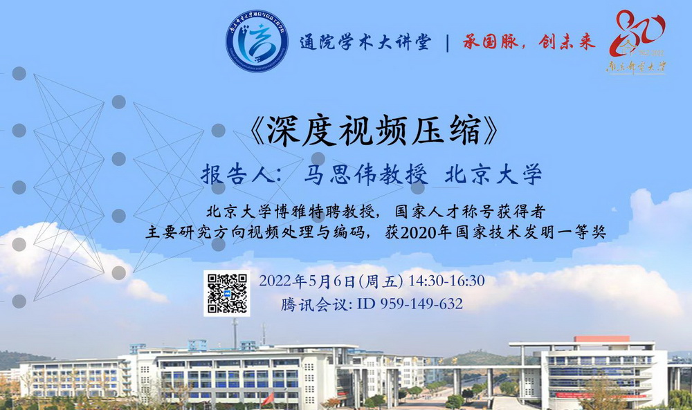 2022年5月6日星期五下午,我院将邀请IEEE Transactions onCircuits and System for Video Technolgoy(TCSVT)、Journal of Visual Communication and Representation(JVCIR)期刊编委(AE)、国家级人才称号获得者、北京大学马思伟教授来我院作“深度视频压缩”专题报告。本次专题报告是为庆祝我校成立80周年太阳集团tyc151cc举办的第4次“通院学术大讲堂”校庆系列报告会,进一步增强了校内浓厚的学术氛围,增进研究生间的学术交流,提升研究生的科研水平和创新能力,丰富广大研究生校庆期间的活动内容。