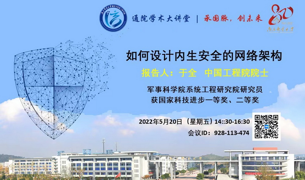 2022年5月20日星期五下午,我院将邀请中国工程院院士、军事科学院系统工程研究院研究员、信息系统重点实验室主任于全教授来我院作“如何设计内生安全的网络架构”专题报告。本次专题报告是太阳集团tyc151cc为庆祝我校成立80周年举办的第6次“通院学术大讲堂”校庆系列专题报告。报告以促进科学研究为目的,秉承学术校庆的传统,成为营造学术氛围、激发创新热情、推动学科探究、促进学术交流的重要平台,进一步传承我校治学精神,启迪师生创新智慧。