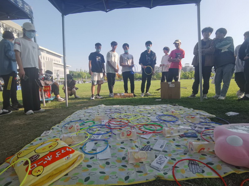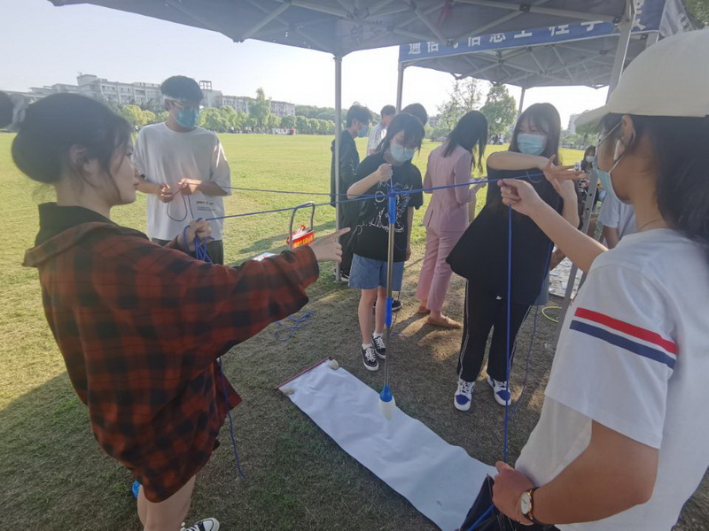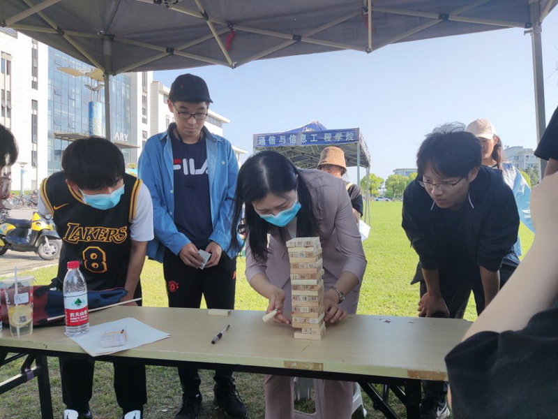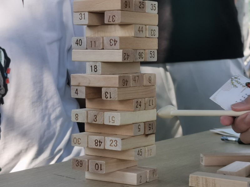 投壶是古代一种常见的投掷游戏,负责同学从投壶的起源、历史以及发展等方面进行了介绍。介绍后,同学们屏息凝神,瞄准箭筒,一支支箭矢划成了一道道优美的弧线,准确的落入箭筒中,博得阵阵喝彩;叠叠高是一款经典的木制益智积木玩具,积木搭放的过程也能提高同学们的耐心,可锻炼手部肌肉灵活应用,在游戏过程中,同学们四人为一组,你来我往,迁思回虑,用小木槌轻轻敲出交叉摆放的木块,充满欢乐;趣味书法体验是由5-6位同学组成一组,共同完成一幅书法作品,这对于同学们的协作能力要求较高,大家摈弃浮躁,静下心来,仔细认真的完成,增强了团队协作能力。在完成项目后,同学们会获得相应的积分,积分可以用来参加活动的彩蛋——套圈。