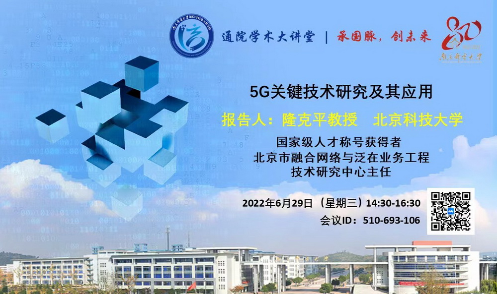 2022年6月29日星期三下午,我院将邀请国家级人才称号获得者,北京科技大学隆克平教授来我院作“5G关键技术研究及其应用”专题报告。本次专题报告是太阳集团tyc151cc为庆祝我校成立80周年举办的第11次“通院学术大讲堂”校庆系列学术活动。报告围绕5G关键技术探讨新型5G网络架构,列举5G技术在相关产业领域的应用,旨在大力培育和弘扬科学精神,彰显南邮学者立足科技前沿、服务国家建设的志向和情怀。八十载如歌长卷,八十载铸就辉煌,一代代南邮人心系国脉,上下求索,谱写出一首信息报国的壮丽诗篇。
