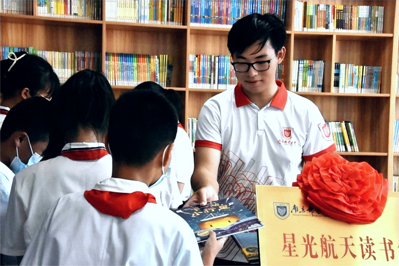 实践团成员在为都会小学学生们赠送航天科普图书