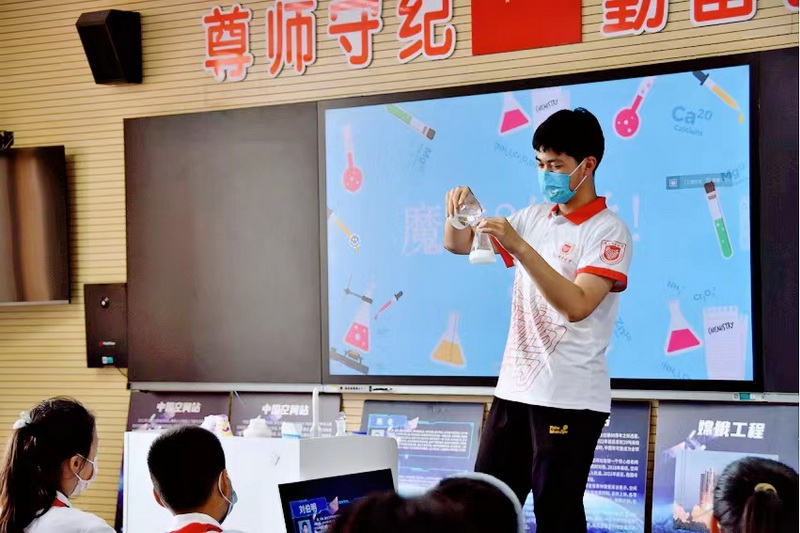 科普实践课环节,实践团充分准备了“赓续红色基因,传承家国情怀”理论普及课、“探索律动音符,奏响青春华章”主题音乐课、“巧用化学之趣、点亮美好生活”化学实验课、“问天·求索,共筑航天梦”系列活动以及“描摹科技蓝图,引领梦想起航”科技展示活动。