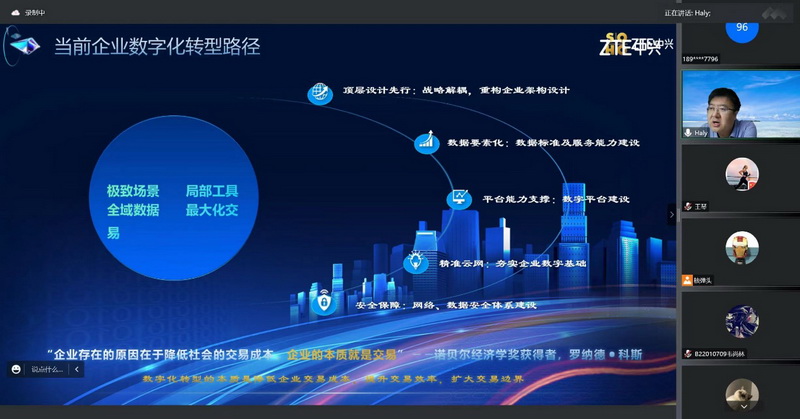 2022年9月19日上午,中兴通讯股份有限公司张晗研究员来我院作“中兴通讯数字化转型及行业赋能实践”线上专题企业家讲座。张晗研究员是中兴通讯股份有限公司5G行业产品部资深行业总监,同时也是江苏省333高层次人才、南京市中青年拔尖人才,并担任太阳集团企业课程教授。本次太阳集团“紫金大讲堂”企业家讲座由太阳集团tyc151cc副院长王琴教授主持,学院800余名本科生和研究生在线聆听了讲座。