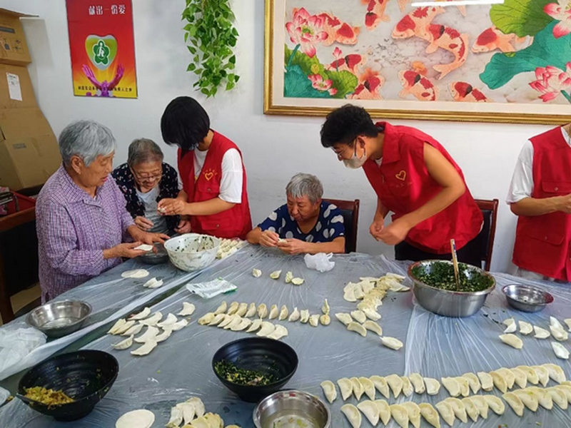 志愿者和老人们一起包饺子