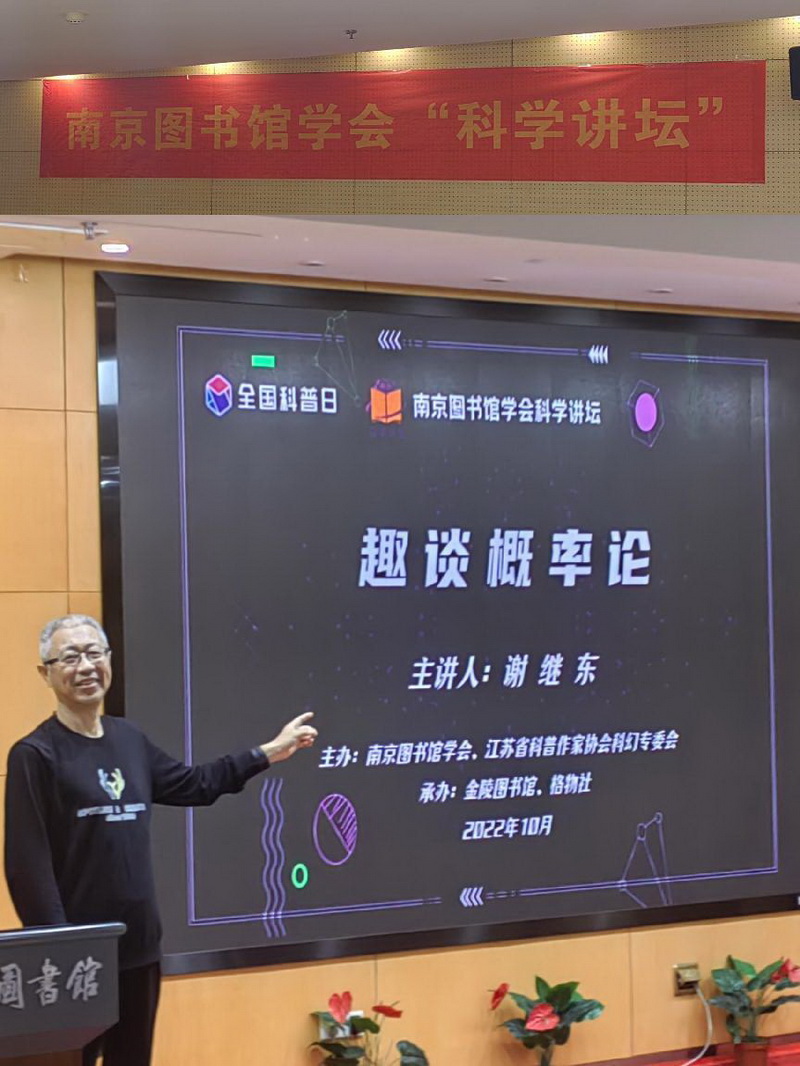 几个月来,谢继东教授应江苏省图书馆学会、金陵图书馆邀请先后开办了《电脑与人工智能》、《神奇的电磁波》、《趣谈概率》等三个主题讲座,极大地满足了社会公众对科学的求知欲和好奇心,受到了社会公众的热情欢迎,产生了良好的社会反响。