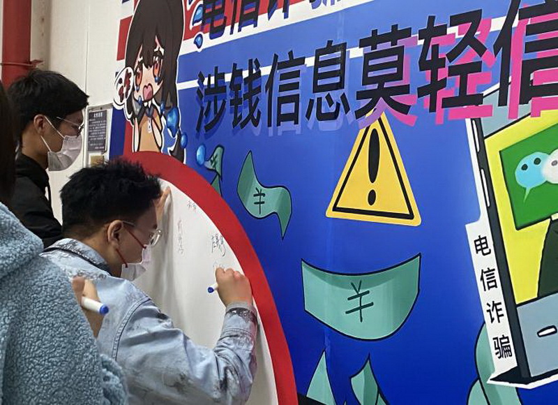 班会伊始,由通院学子组织表演的小品《诈骗犯的失败之路》,以幽默诙谐的方式迅速活跃了现场气氛,同时向同学们展示了各类电信诈骗的常见形式,在阵阵欢笑声中,增加了同学们对电信诈骗的了解。小品过后,防诈骗知识竞赛随之开始,同学们分为六个小组以积分制进行比赛。大家踊跃参与,现场气氛热烈,同学们在互动问答中学习到丰富的防诈知识。随后,参会成员全体起立,进行宣誓,坚决抵制网络诈骗,传播正能量,弘扬主旋律!最后,所有参会同学依次在防诈宣传栏处郑重签下自己的姓名,将誓言牢记在心。让更多同学能够充分了解到防范电信诈骗的重要性。