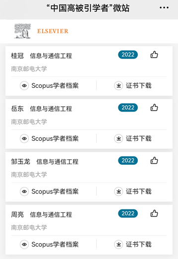 2023年3月28日,全球性信息分析公司爱思唯尔(Elsevier)正式发布了2022“中国高被引学者”(Highly Cited Chinese Researchers)榜单。其中信息与通信工程学科全国入选学者共96名,我校信息与通信工程学科有4名,其中我院邹玉龙教授、桂冠教授、周亮教授等3名教师入选。