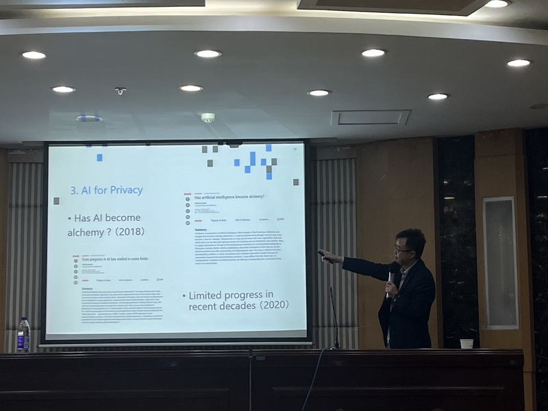 余水教授首先从大数据技术的基本概念出发,详细讨论了大数据隐私的挑战和来源。余教授认为问题的关键在于如何平衡数据的可用性和隐私保护性,并指出了详细的研究方向:隐私度量、大数据建模、可用的数学工具。在此基础上余教授对问题进行了刨析,同时给出了问题的可能解决方向。最后余水教授对AI研究中的隐私研究进行了梳理和讲解,还热情邀请同学们前往悉尼科技大学进行学术交流。