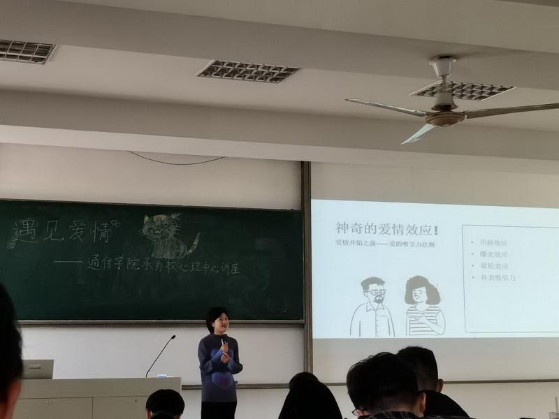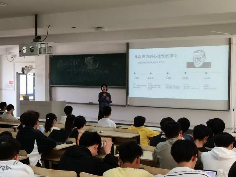 随后,张本石老师将时间线拉到爱情开始之前,提到了一些有趣的恋爱效应,比如吊桥效应、曝光效应、光环效应等。老师绘声绘色地描述了心理学家做的实验,又联接我们的生活,提出了一些追求异性的小技巧。紧接着,老师又为大家介绍了斯滕伯格的爱情三角形理论、弗洛伊德的心理发展理论以及成年人依恋类型,列出了一条构成完美爱情的方程式,为同学们的爱情指明了方向。