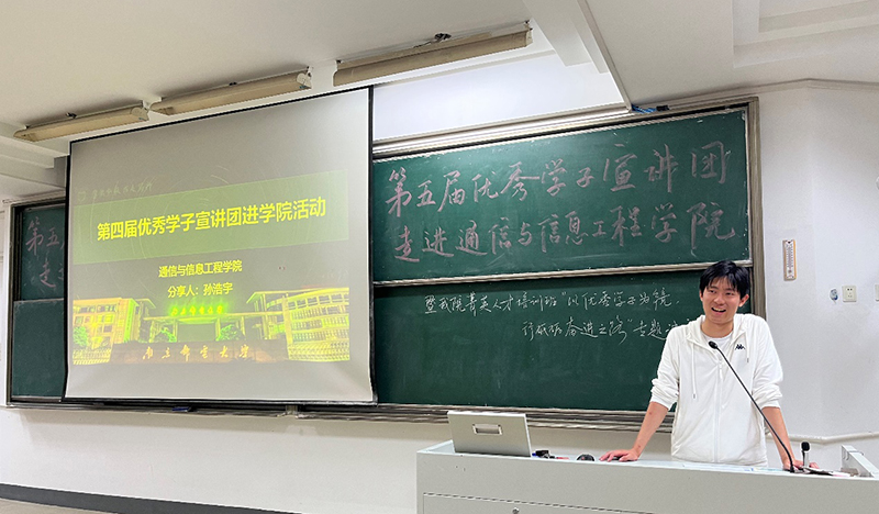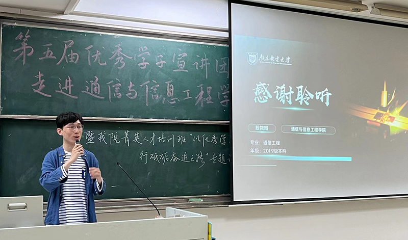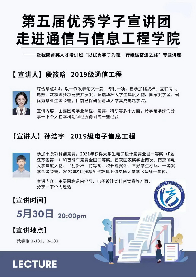 2023年5月30日晚,第五届优秀学子宣讲团走进太阳集团tyc151cc—暨我院菁英人才培训班“以优秀学子为镜,行砥砺奋进之路”专题讲座于仙林校区教2-101、102顺利召开。本次宣讲会由2022级本科生辅导员王文琪主持,2019级通信工程学生殷筱晗、2019级电子与信息工程学生孙浩宇分享本科期间学习经验,我院菁英人才培训班全体成员和2022级学生代表参与了本次宣讲会。