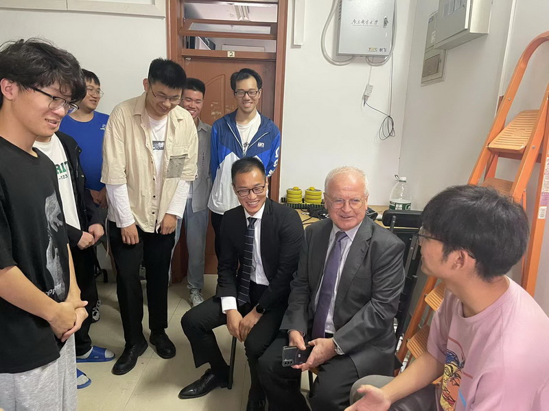 Hikmet Sari教授、桂冠教授与FocusLab团队成员深入柳苑宿舍,为同学们答疑解惑。桂冠教授和其团队成员首先介绍了团队研究方向,接着就同学们对目前无线通信最前沿领域技术,考研复试的难度以及科研需要提前学习的技术和本领等问题,一一做出了解答。期间,Sari教授也用英文与学生亲切交谈。桂冠教授希望同学们能全力以赴,一战成硕,同时也要保持积极向上的心态,时刻准备为国家贡献自己的力量。