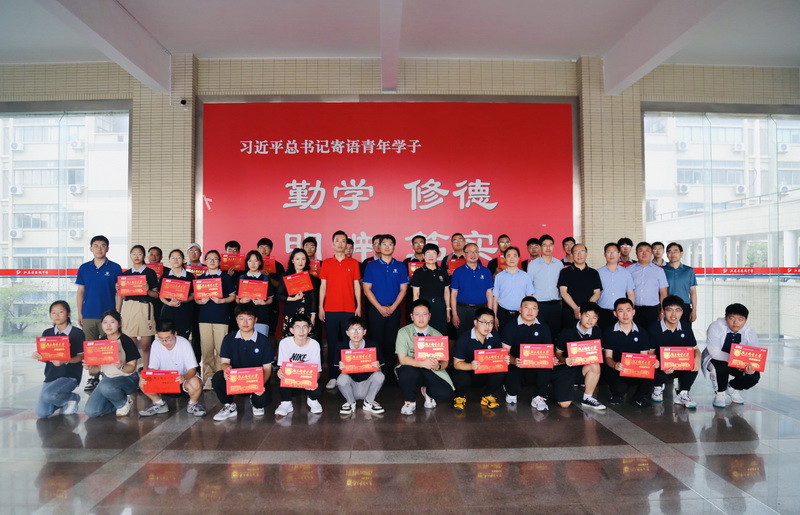 王友国副校长向三所学校在今年高考中取得的优异成绩表示祝贺,对考取南邮的优秀学子表示热烈的欢迎。王校长简要介绍了我校的发展历程、办学特色、科研成果、杰出校友、学科竞赛成果等内容,他勉励同学们不忘初心,砥砺前行,进入大学后树立远大理想,为实现中华民族伟大复兴的中国梦不懈奋斗。王友国副校长向三所中学校长一一赠送喜报,为每一位新“柚子”颁发录取通知书并合影留念。