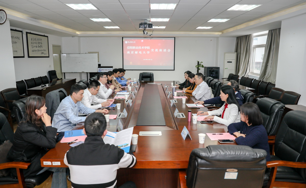10月7日下午,信阳职业技术学院校长李森一行来我院座谈交流。我校党委常委、副校长肖甫热情接待了李森校长一行。交流座谈会在三牌楼校区科研楼208会议室举行,信阳职业技术学院副校长王豪、我院副院长赵海涛出席交流座谈会。座谈会由我校产学研合作处处长杨静主持。