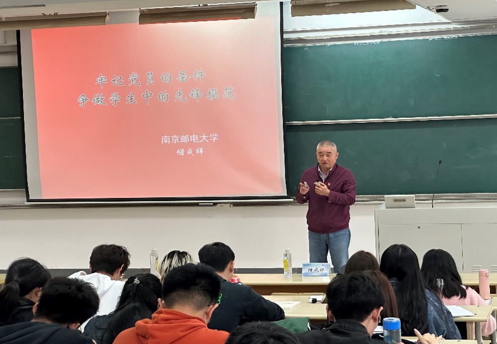 校关工委讲师团储成祥教授以《牢记党员条件,争做先锋模范》为题为同学们深度剖析了党员的条件、党员的权利与义务以及如何争做先锋模范。储教授勉励同学们要不断增强实干本领、提高党性修养,在党的光辉旗帜下,坚定不移地听党话、跟党走,时刻准备着为共产主义事业而奋斗。