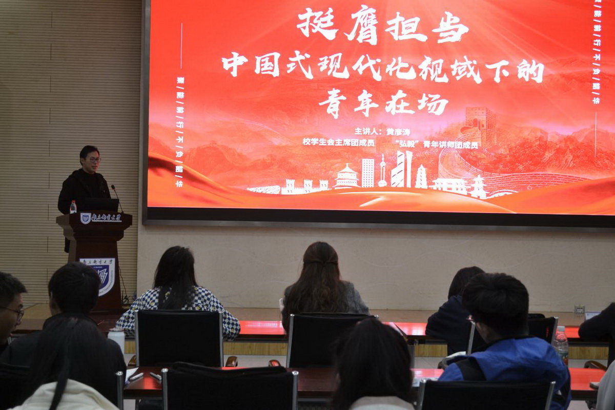 本次会议还邀请到“弘毅”青年讲师团成员逯星辰和黄彦涛两位同学做主题宣讲。他们分别从《在大国外交中感悟中国担当》《中国式现代化视域下的青年在场》的主题进行了宣讲。逯星辰同学讲述了“大国外交”在当今时代的重要意义,呼吁同学们在习近平新时代中国特色社会主义思想旗帜下,进一步学习习近平外交思想。黄彦涛同学从青年在中国式现代化视域下的历史作用、主体功能和未来向度三个维度强调了青年在全面建设社会主义现代化国家进程中的重要作用,明确了新时代青年的责任担当。