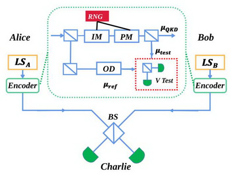 图一、基于HOM干涉的刻画TF QKD光源安全性方案示意图