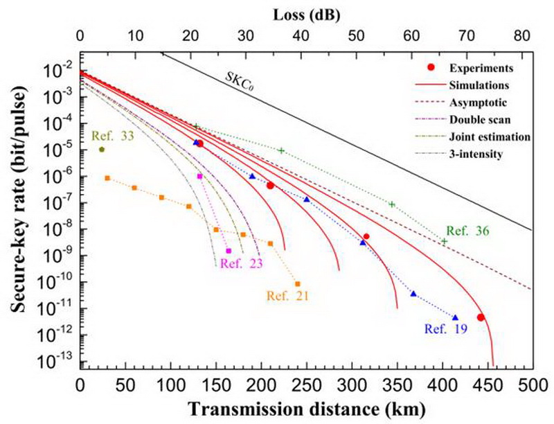 工作三:针对现有测量设备无关协议存在传输距离有限、密钥率低等缺点,该团队提出了改进的偏选基五强度诱骗态测量设备无关协议,通过使用Vandermonde矩阵和McDiarmid不等式有效降低统计涨落,并且结合自研的实验系统实现了442公里的安全传输距离,创造了该类协议新的世界记录。