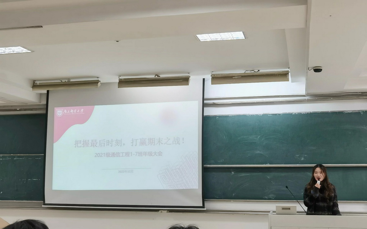 为了迎接即将到来的期末考试,我院2021级通信工程专业B210101-07班于12月13日下午14时整,在仙林校区教3-101召开了以“把握最后时刻,决胜期末之战”为主题的年级大会。本次会议由辅导员芦薇主持,B210101-07班全体同学积极参与。