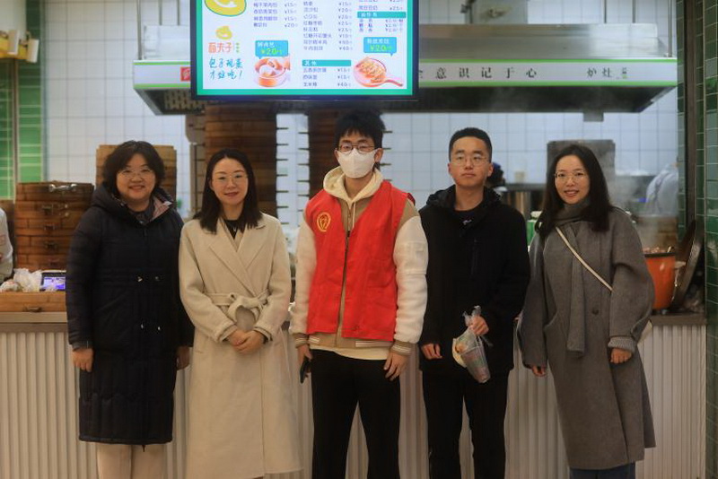 学院党委副书记王小露、江苏源本科技(集团)股份有限公司总经理唐佩、辅导员李晨冉、学生志愿者和最后一位领取早餐的同学合影留念