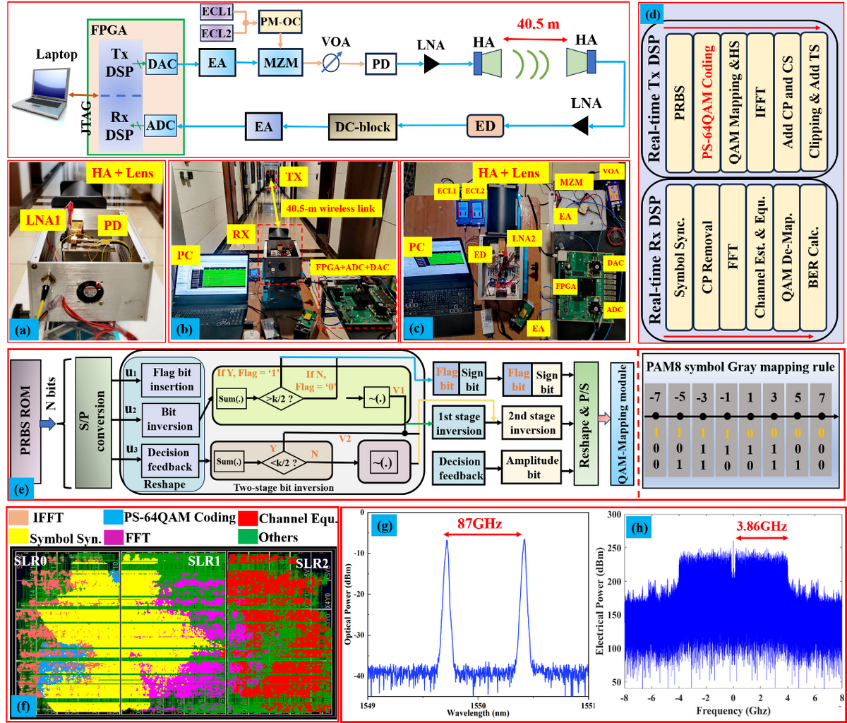 在该项研究成果中,首次展示了实时光子毫米波高速远距离无线通信技术,系统性融合光子毫米波产生、高增益天线传输和低成本包络检波接收技术,并通过基于高性能FPGA板卡实现低复杂度概率整形数字信号处理算法解决包络检波非线性问题,在国际上首次实现和展示了实时87 GHz载波频率下单通道23 Gbps毫米波40.5米无线传输,创造出世界上公开报道的实时光子毫米波通信最远传输距离、最大速率-距离积等传输记录。该方案还能与高速光纤接入网实现无缝融合,优化6G无线通信网络的基础设施和通信结构,显著降低 6G研发门槛,大大加速实时毫米波技术商用化进程。