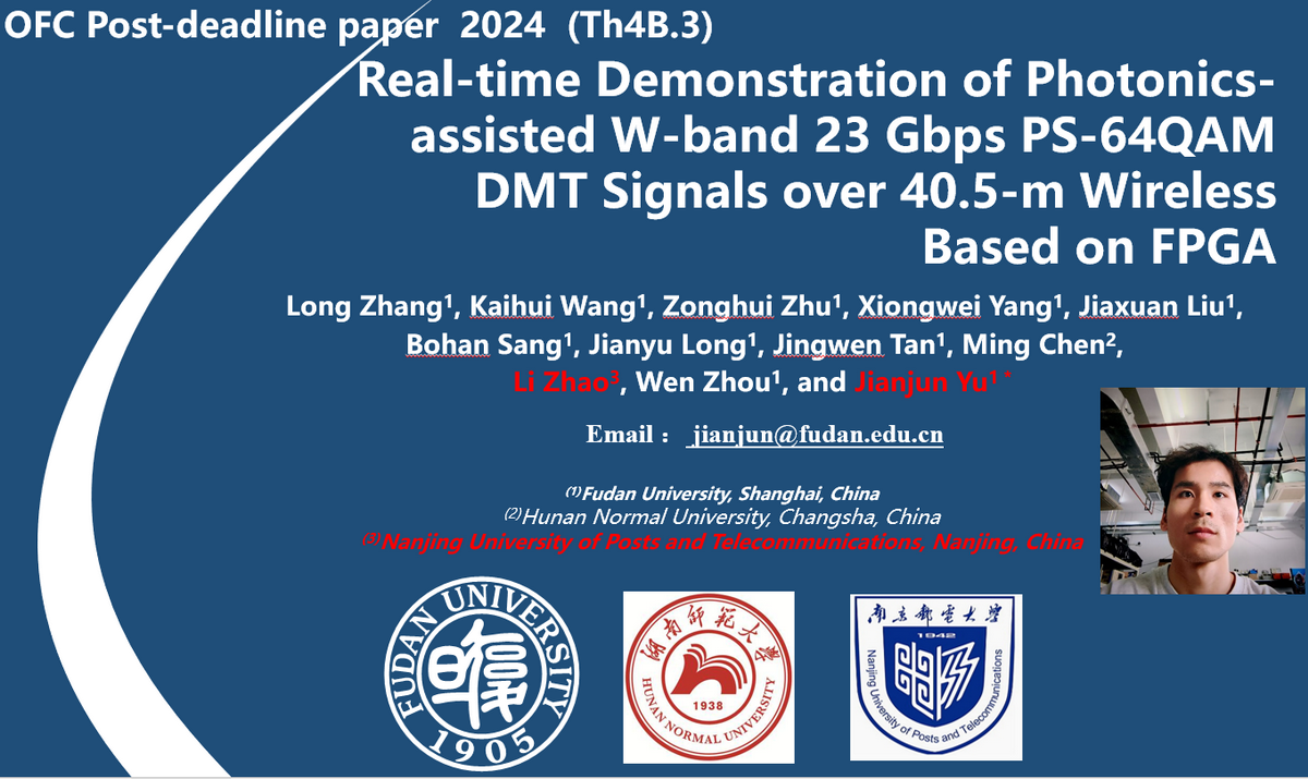 我院在实时W波段通信方面2项创纪录研究成果登上全球顶尖会议。近日,复旦大学余建军教授和我院赵利教授合作,在光子辅助的W波段实时通信方面的2项创纪录研究成果在2024年全球顶尖会议OFC上报道。OFC会议是光通信领域中全球规模和影响力最大的国际性会议,PDP论文旨在发布光通信领域的最新技术进展和纪录性成果,代表着业内当前最高技术水平,在光通信领域具有高度权威性。本届会议PDP论文全球仅24篇。国内仅有3篇PDP论文录用。