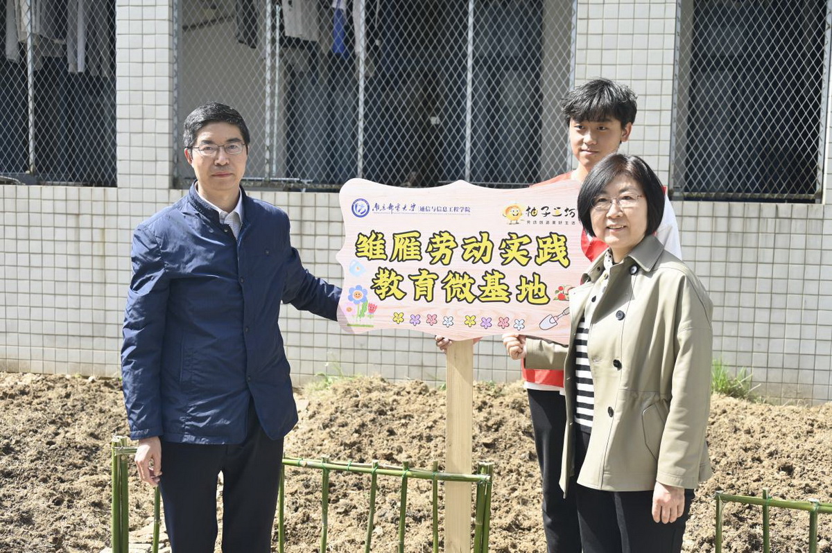 活动现场,姜小舜副校长、徐雷书记和学生志愿者为雏雁劳动实践教育微基地立牌。