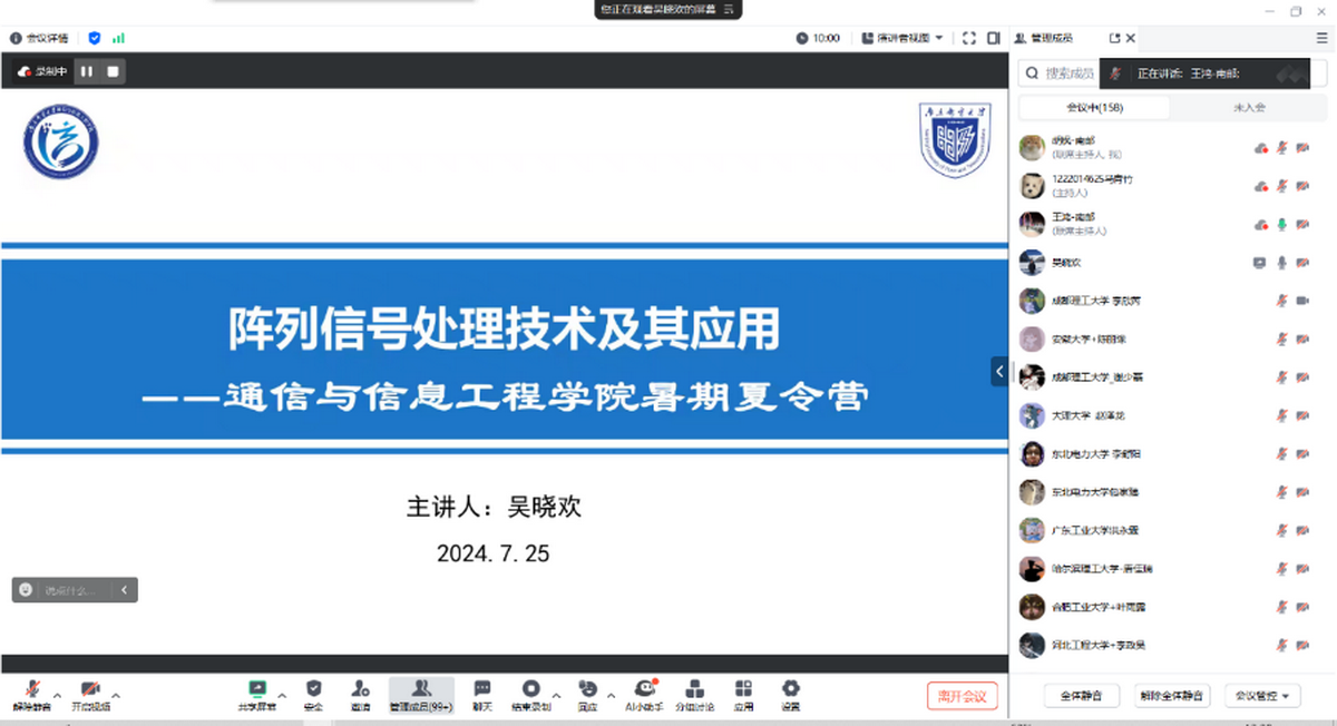 在专题讲座环节中,嘉环科技副总裁陈哲先生、学院张军教授、学院吴晓欢副教授、学院博士生王宇翱分别就《人工智能驱动的产业与教育模式变革》、《无线通信发展历程--从 1G 到 6G》、《阵列信号处理技术及其应用》、《青春勇向前,研途创未来》等主题为同学们带来了内容丰富、引人入胜的专题报告。