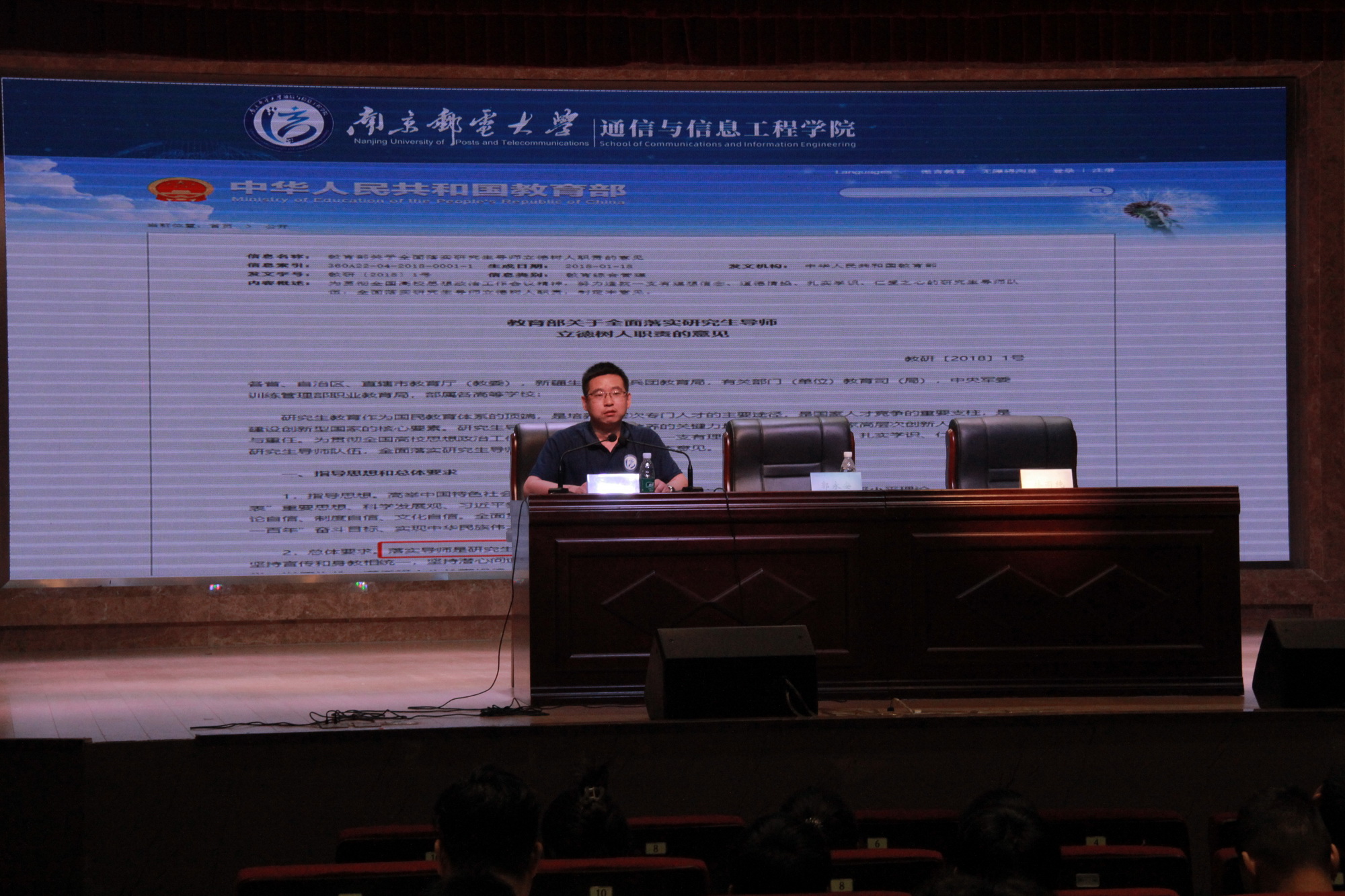 教师代表、博士生导师吕文俊回忆了自己在南邮的求学生涯,希望同学们珍惜研究生阶段的宝贵时光,养成终身学习的习惯;注意培养逻辑推理能力,坚持独立思考、唯实求真,把自己培养成一个脱离低级趣味、有益于他人、有益于社会、有益于国家的人。