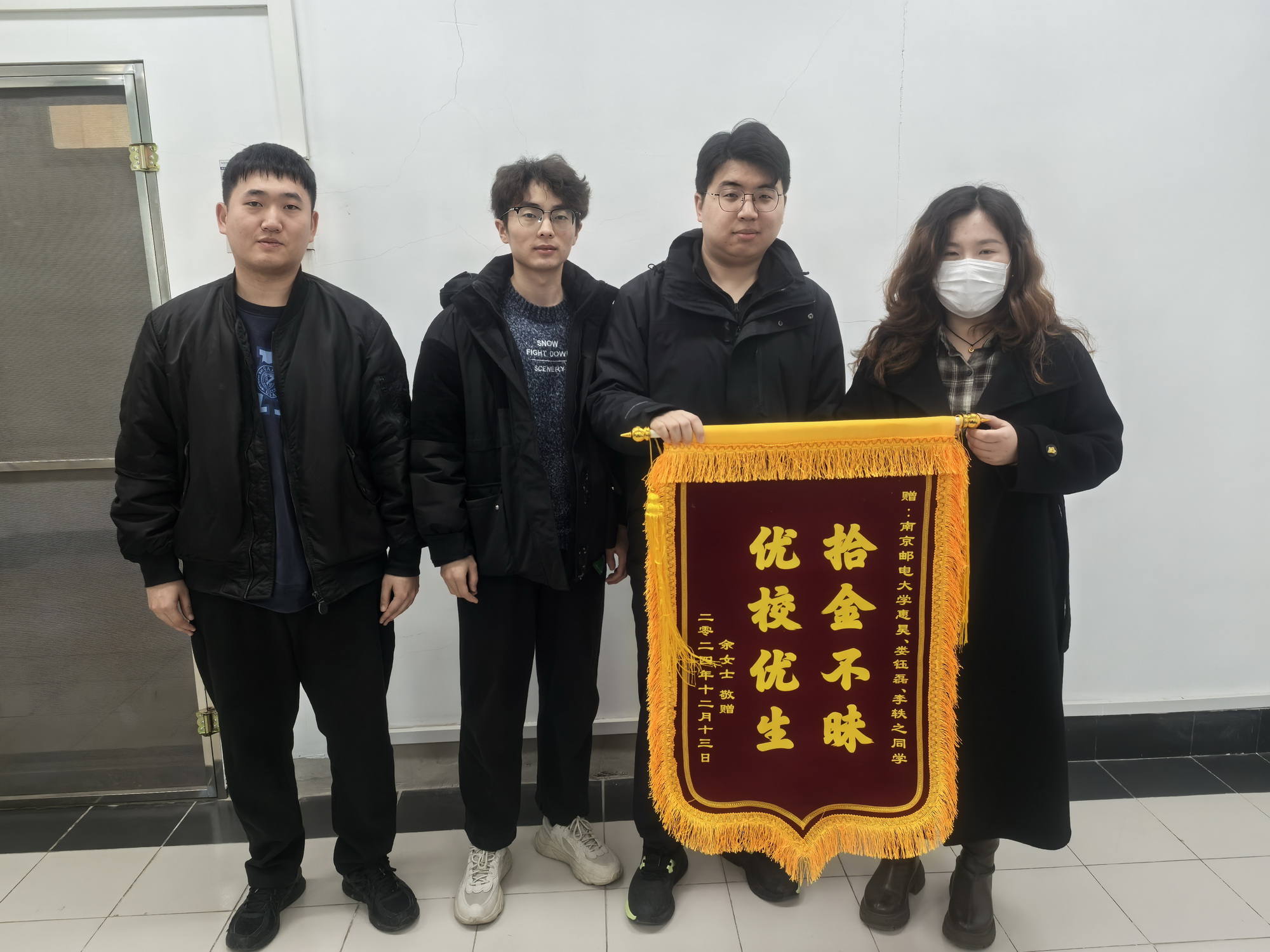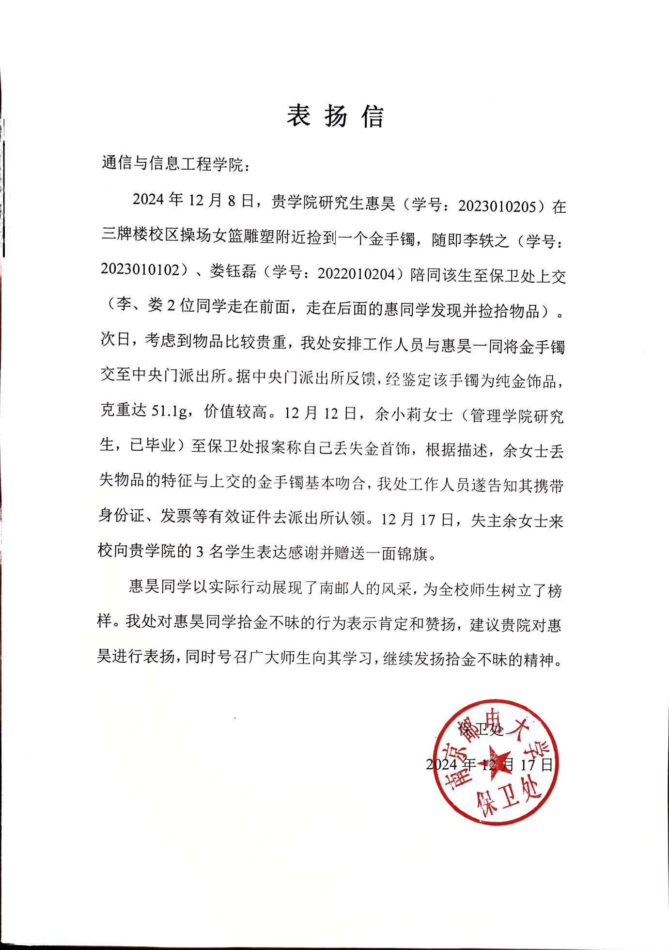 校友余女士至学校保卫处报案称自己丢失一件克重51.1的金首饰,根据她的描述,保卫处工作人员告诉她携带有效证件去派出所认领。之后,失主余女士来学校向3名同学赠送一面锦旗表示感谢。保卫处对惠昊同学拾金不昧的行为表示肯定和赞扬。