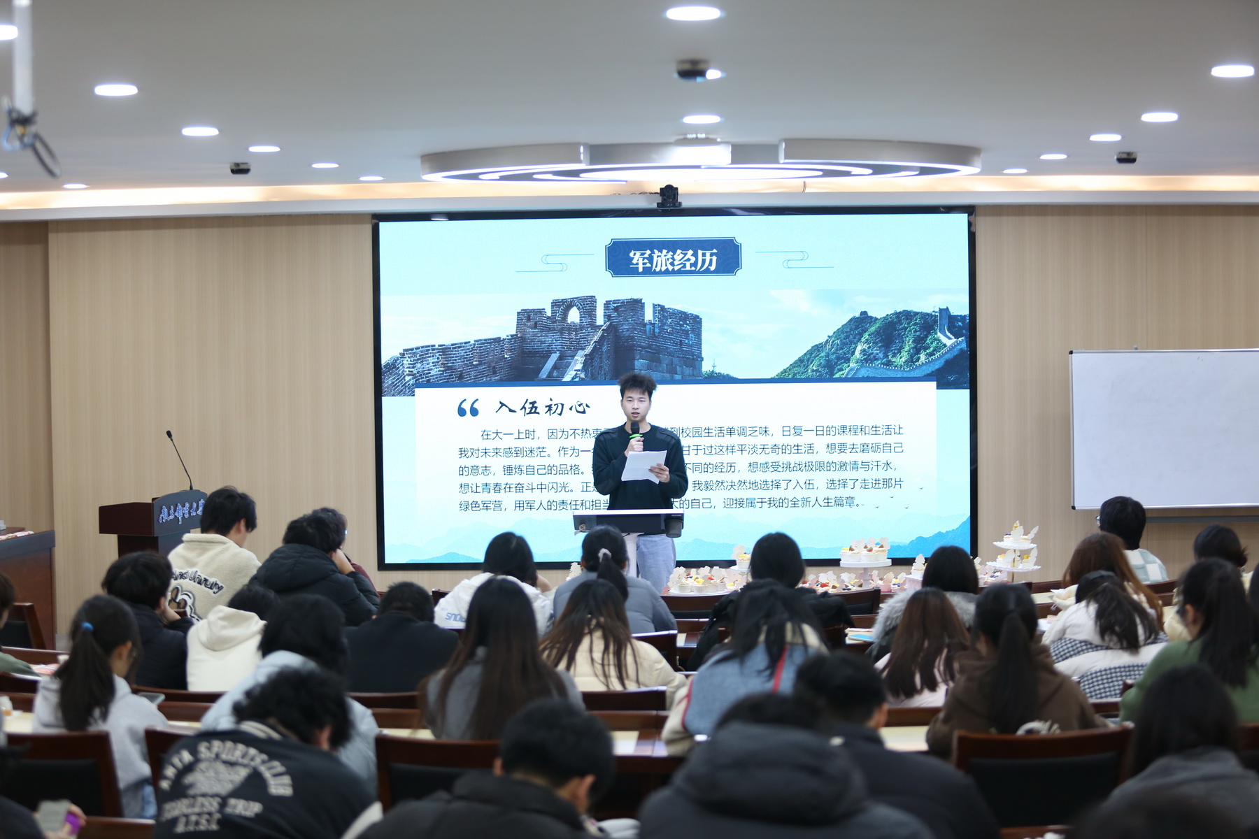 在“鸿雁领航——优秀学子分享”环节,魏雪强同学讲述了自己从军营到校园的蜕变历程,分享了自己如何锤炼军人精神,并将军人精神运用到校园学习生活中。魏雪强同学,在服役期间,荣获“新训标兵”、“四有优秀军人”等荣誉。复学后,他延续军人品质,踔厉奋发、笃行不殆,取得了绩点专业第一的优异成绩,荣获太阳集团年度人物、国家奖学金、太阳集团“三好学生”等荣誉。他鼓励同学们要坚定目标,勇毅前行,用青春热血书写忠诚与奋斗的篇章。