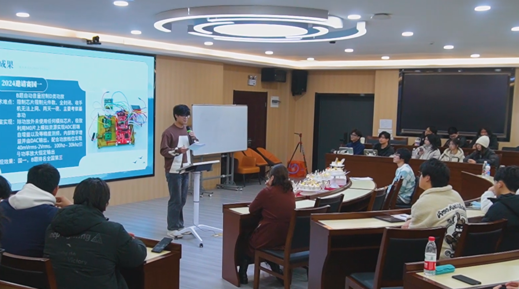 随后,徐立铭同学上台发言,介绍了自己在学科竞赛中取得的优异成绩。徐立铭同学深耕专业知识,砥砺技能水平,荣获2023年全国大学生电子设计竞赛国家一等奖、2024年全国大学生电子设计竞赛模拟系统设计邀请赛国家一等奖、2024年全国大学生嵌入式系统设计竞赛FPGA赛道国家一等奖。徐立铭同学围绕信息收集、队伍组建、技能实操等方面,详细分享了自己的竞赛历程和心得体会,为同学们提供了宝贵的经验和建议。