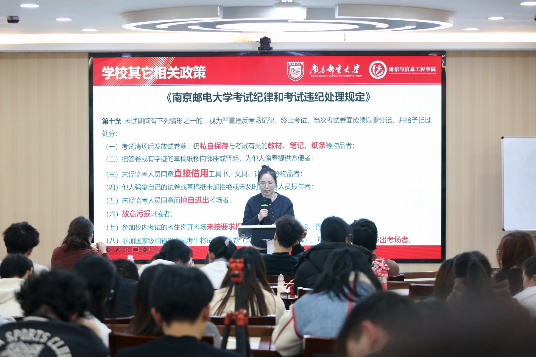在诚信教育环节,李晨冉老师再次强调了诚信考试的重要性,指出同学们应传承南邮红色基因发扬信达天下自强不息的南邮精神,砥砺品格、增强本领,成为具有高尚品德和专业技能的信息通信技术人才。