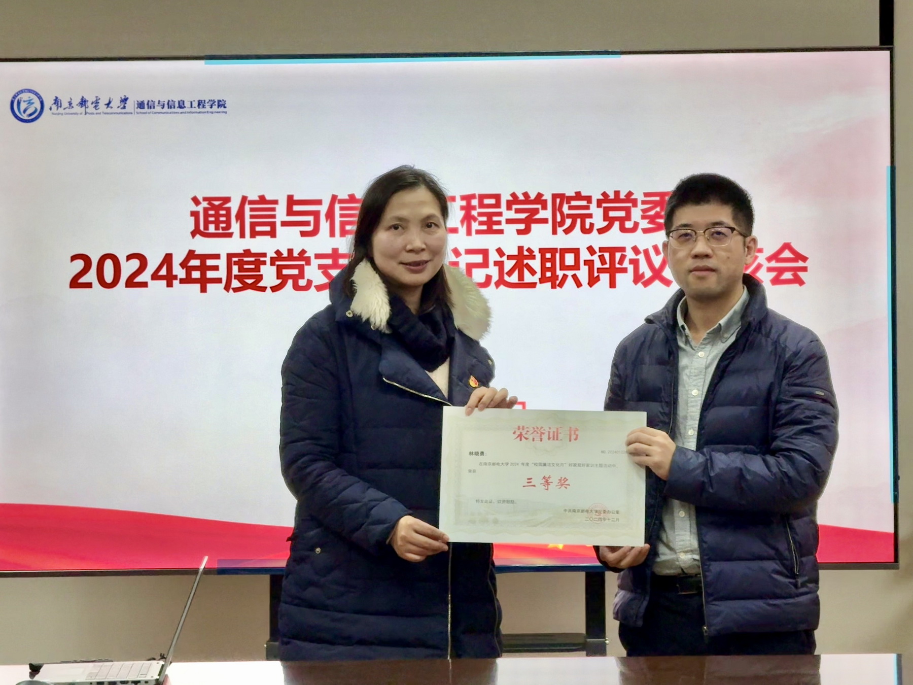 徐雷书记作总结讲话。他通报了学院党委通过首批“全省党建工作标杆院系”验收的情况,代表学院党委总结了在两年多的创建期内的努力和成绩;充分肯定了各党支部2024年的工作,衷心感谢各位党支部书记的辛勤劳动;要求各党支部全面贯彻落实新时代党的建设总要求,严格做到“七个有力”,进一步创新工作方法,进一步发挥基层党组织的战斗堡垒作用和党员的先锋模范作用,为建设信息通信领域特色鲜明的高水平研究型学院提供坚强组织保证。
