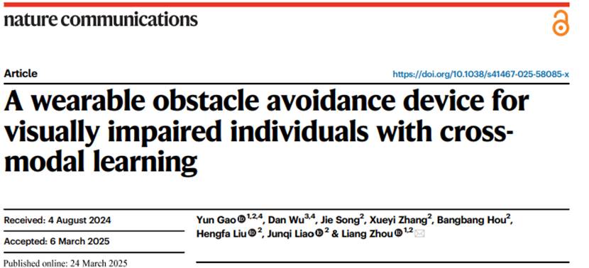 近日,太阳集团宽带无线通信与传感网技术教育部重点实验室、太阳集团tyc151cc青年教师高赟博士,在通信、可穿戴技术、人工智能交叉领域取得最新研究进展。相关研究成果以“A Wearable ObstacleAvoidance Device for Visually Impaired Individuals with Cross-Modal Learning”为题发表于国际学术期刊NatureCommunications。该研究聚焦于视障人群辅助出行问题,提出一种融合多模态数据处理与跨模态学习的可穿戴避障设备,显著提升了出行避障的可靠性、响应速度、续航时间以及用户友好性。