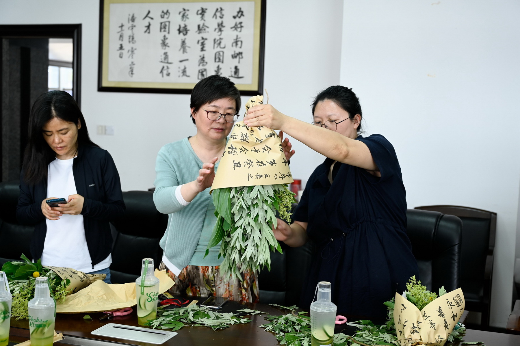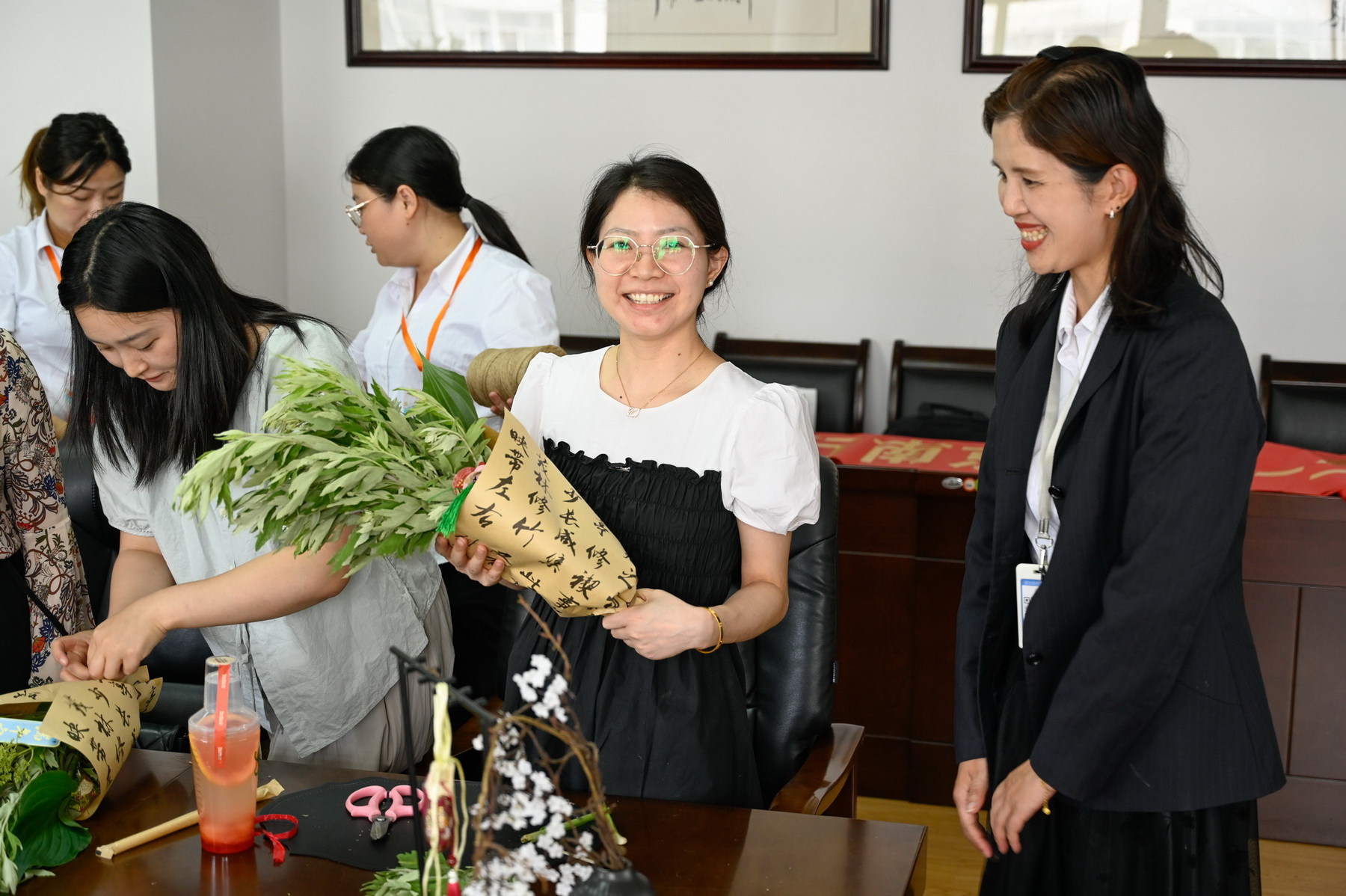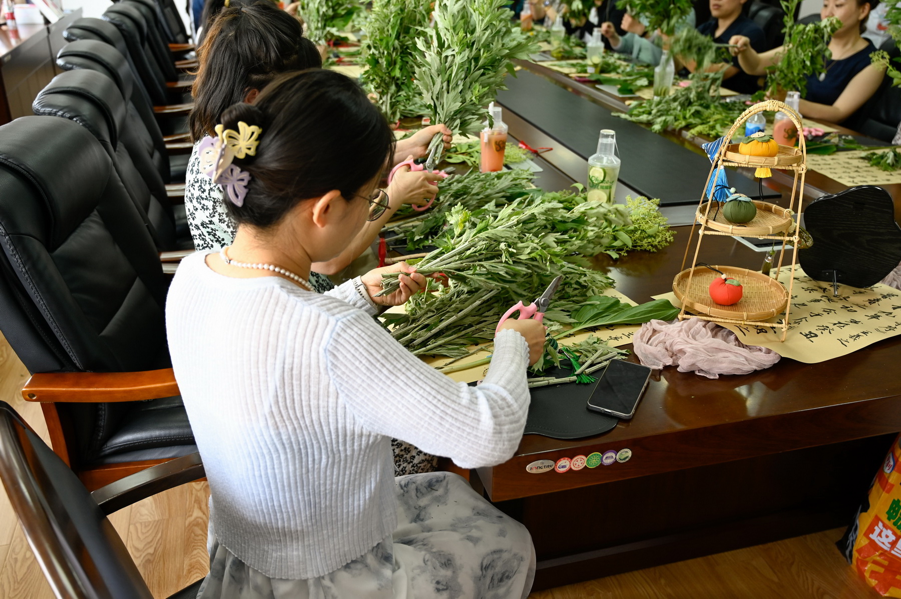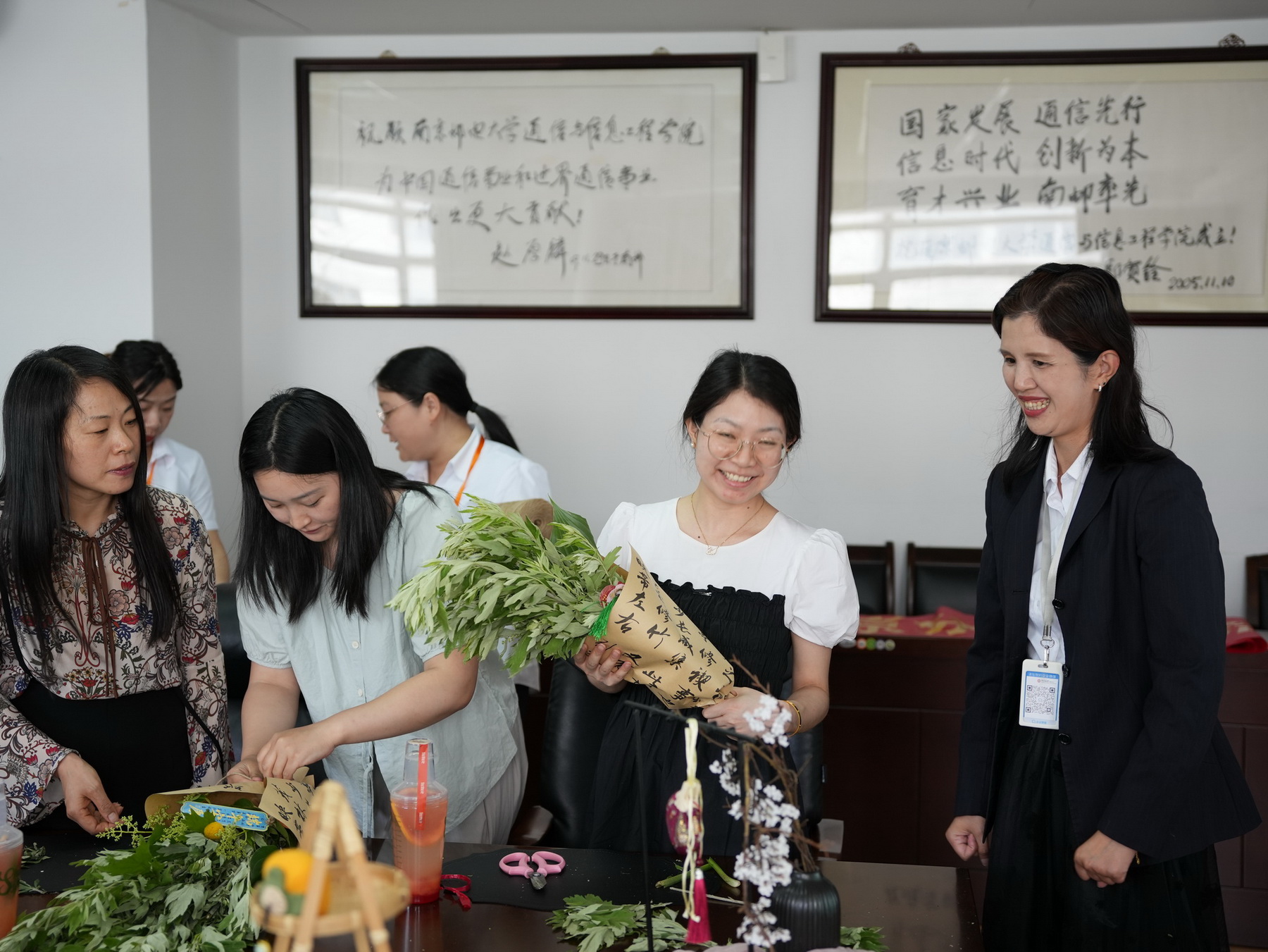 活动现场备齐艾草、菖蒲等植物材料与包装用品。专业花艺老师讲解制作技巧后,教职工们发挥创意,挑选枝叶、搭配花材、缠绕丝带。大家相互交流,现场气氛热烈。