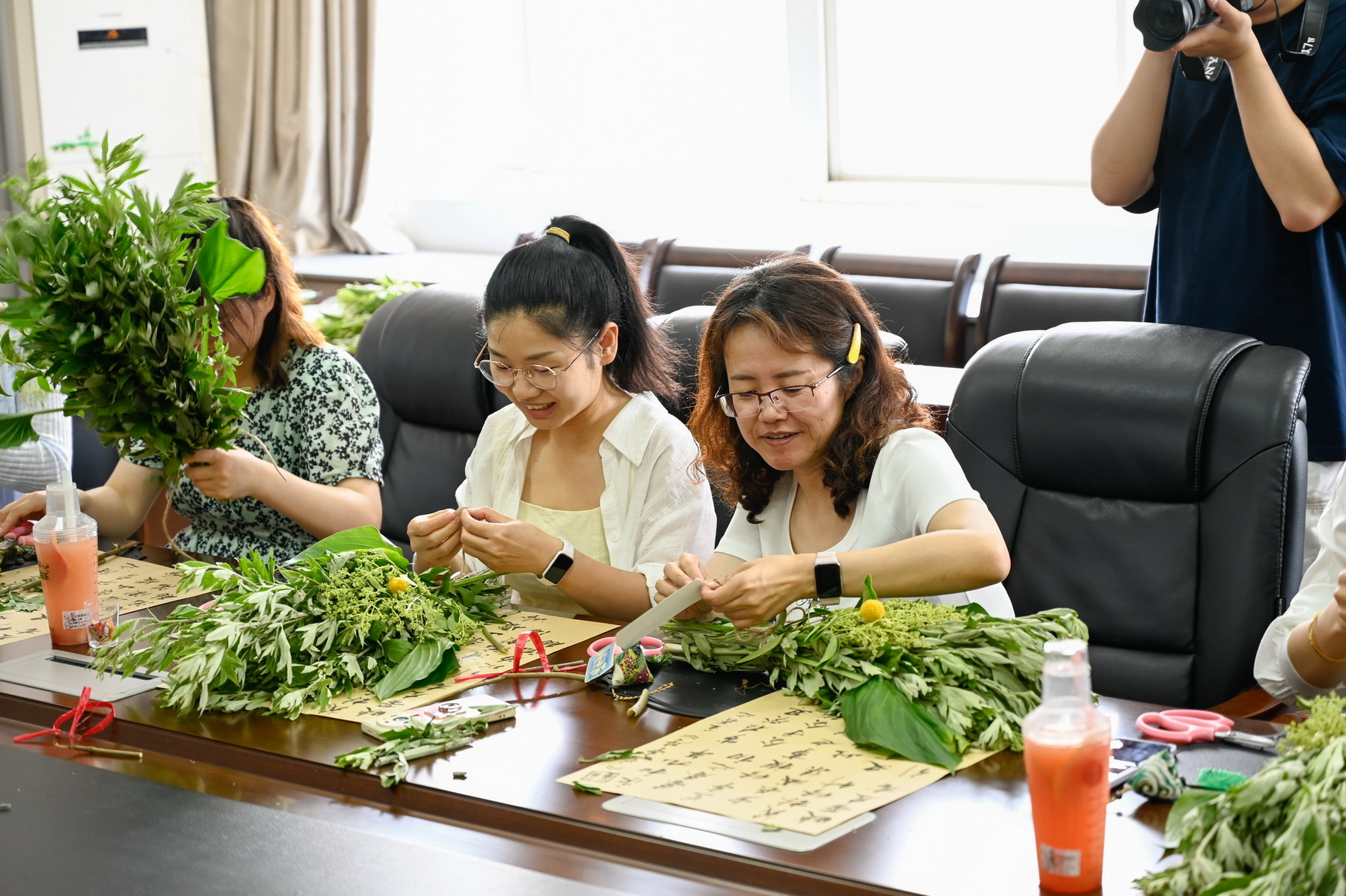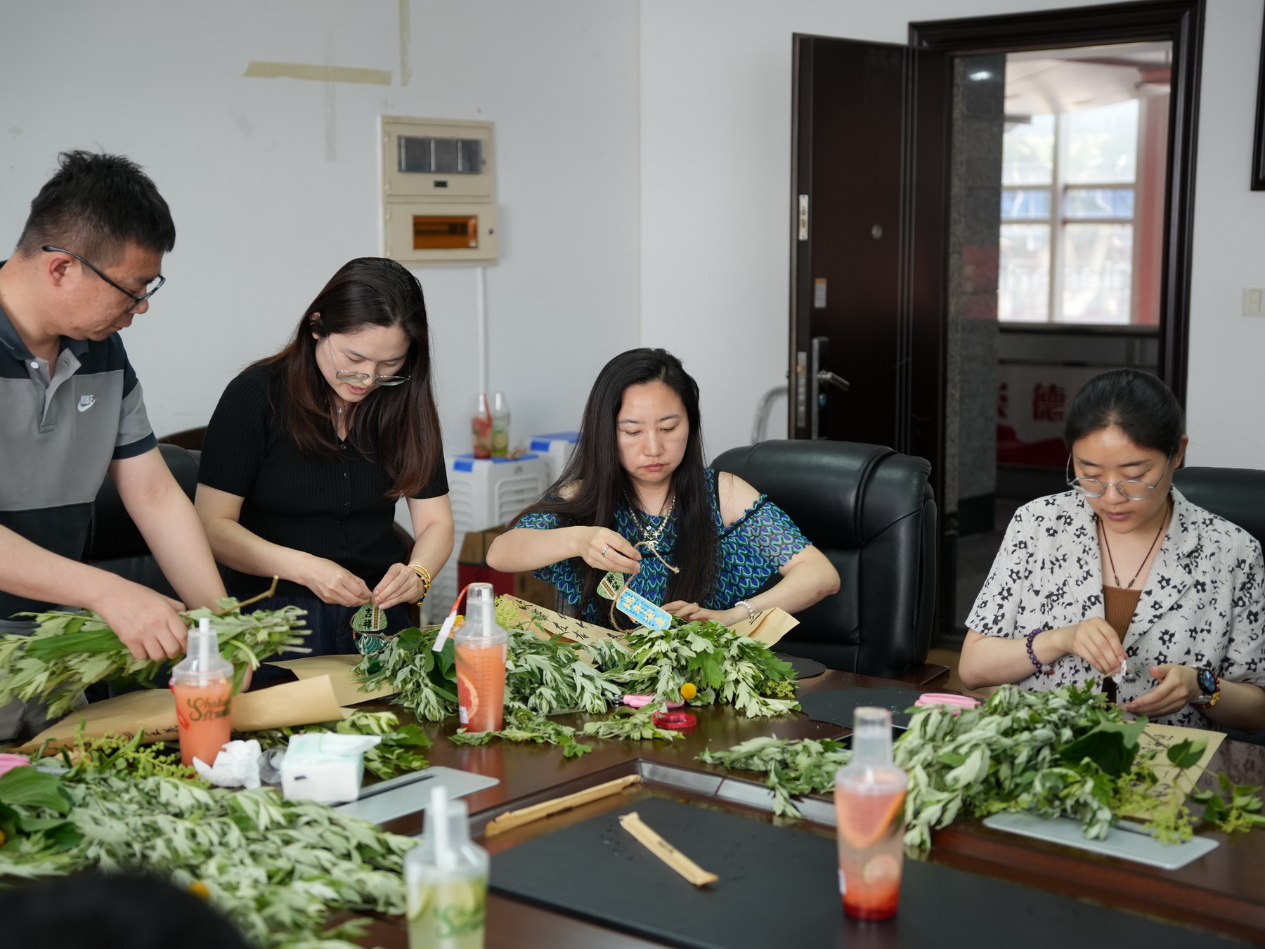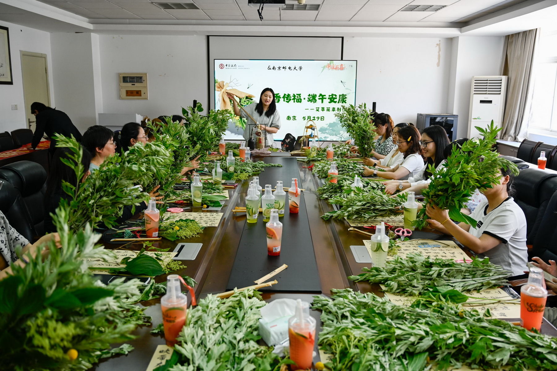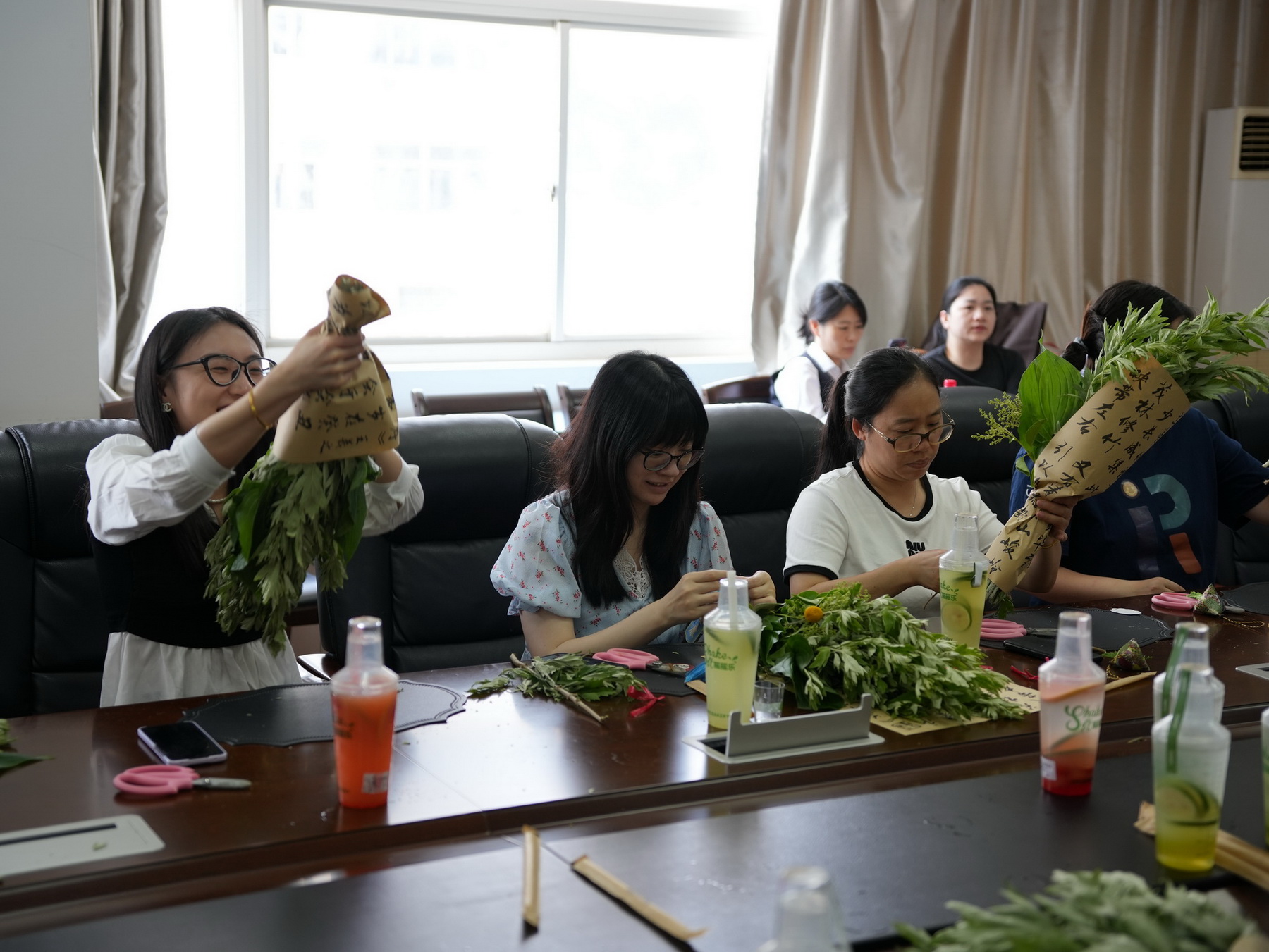 活动现场备齐艾草、菖蒲等植物材料与包装用品。专业花艺老师讲解制作技巧后,教职工们发挥创意,挑选枝叶、搭配花材、缠绕丝带。大家相互交流,现场气氛热烈。