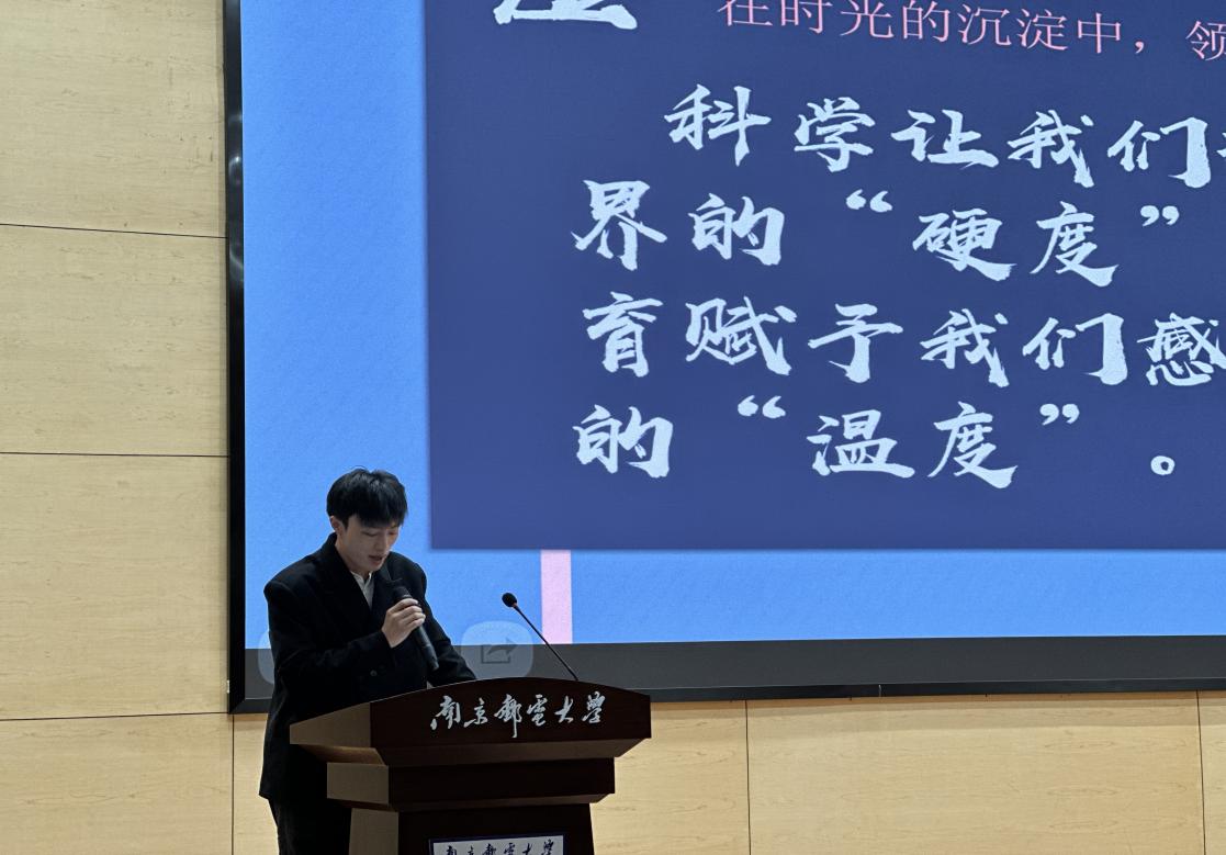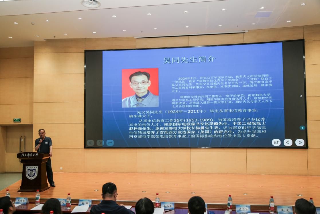 吴永宁先生登台致辞,动情讲述了父亲吴同先生作为南邮早期校友的峥嵘岁月。他以珍藏的老照片为引,娓娓道来老一辈教育工作者“一根教鞭传道、两袖清风育人”的感人往事。吴先生勉励在场学子:要传承“信达天下、自强不息”的南邮精神,以感恩之心回馈社会。