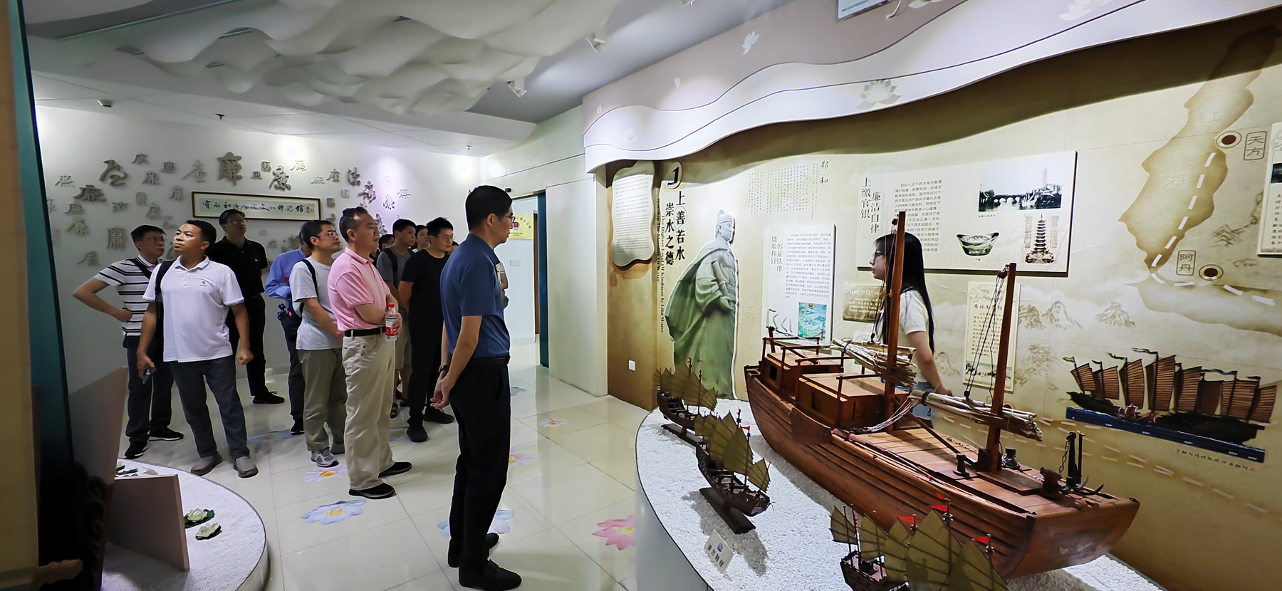 活动首站是位于江东街道宝船社区党群服务中心三楼的宝船社区廉洁文化体验馆。作为全国首家以“郑和宝船”为主题的社区廉洁文化体验馆,该体验馆通过五个篇章:“上善若水,崇水之德”、“平凡坚守,至善至真”、“厚德载物,清水鉴心”、“天道爱人,劝善惩恶”以及“党建引领,江东清风”,巧妙地将“水”与“德”的关联性文化内涵与南京历史人物和普通党员群众的故事相结合,展现了水文化与廉洁文化的完美融合。在讲解员的带领下,大家沿着寓意“步步生廉”的莲花通道,深入了解七下西洋的郑和为查验贪腐“烧船称钉”的故事,学习刘伯承、粟裕、陈光等老一辈革命家的廉洁事迹。