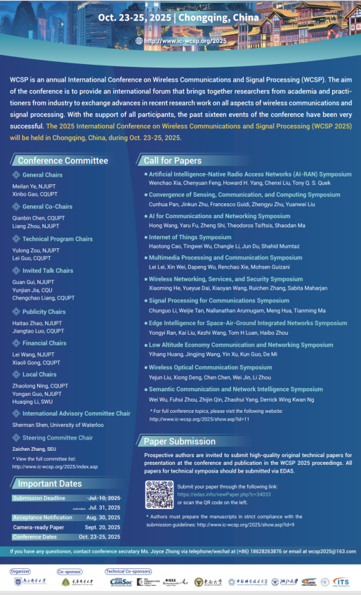 第十七届无线通信与信号处理国际会议(WCSP 2025)组委会决定延长投稿期限至2025年7月31日!