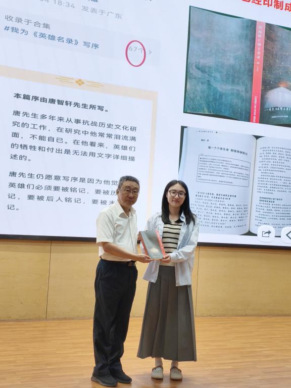 阮佳琪:聆听烈士杨杰后人王伟先生的讲座,我深感先辈们抗日之艰辛。他们在枪林弹雨中无畏冲锋,用热血与生命捍卫山河;他们为民族存亡抛头颅、洒热血的铮铮铁骨,筑起了和平美好的万里长城。八十载光阴荏苒,烽火虽远;山河无恙,盛世繁华。这段历史也在时刻警醒我们:和平非从天降。唯有铭记历史,传承不屈精神,砥砺前行,方能守护来之不易的今天。