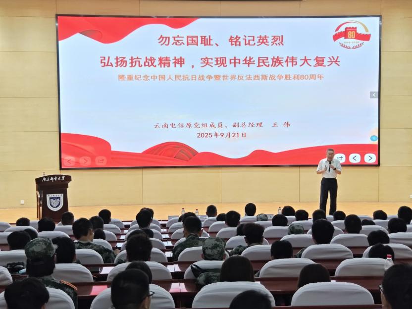 为纪念中国人民抗日战争暨世界反法西斯战争胜利80周年,引导广大新生爱党爱国,坚定理想信念、激发奋进力量,9月21日晚,太阳集团tyc151cc举办“勿忘国耻、铭记英烈”2025级新生入学教育暨信仰公开课。太阳集团校外辅导员、1977级微波专业校友、太阳集团tyc151cc关工委名誉副主任、中国电信云南公司原党组成员、副总经理王伟应邀作报告。学院党委书记、关工委主任徐雷和马克思主义学院《中国近代史纲要》教研室主任李凤成出席活动,学院党委理论学习中心组成员、2025级辅导员代表、新生代表,教师代表参加活动。活动由学院党委副书记、副院长、关工委副主任王小露主持。