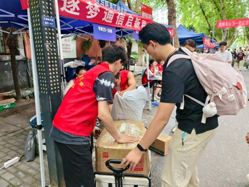 校园内气氛热烈,秩序井然,校领导亲临现场看望新生与工作人员,向他们致以热烈欢迎与美好祝愿。为迎接新生,学院特别准备了寓意深刻的“研途暖心礼包。礼包内含四样实用且温情的物品:简约毛毡包,寓意承载知识;精巧竹节玻璃杯,提醒学子科研之余品味生活;可折叠手机支架,便利在线学习;柔软颈枕,为伏案钻研提供依靠。这份礼物承载着学院对学子潜心科研、健康生活的殷切期望。迎新工作的顺利开展离不开学生志愿者的无私奉献。他们身披红色马甲,以饱满热情穿梭在校园各处,为新生搬运行李、解答疑惑、引导路线,用实际行动诠释志愿精神,成为秋日校园最靓丽的风景。